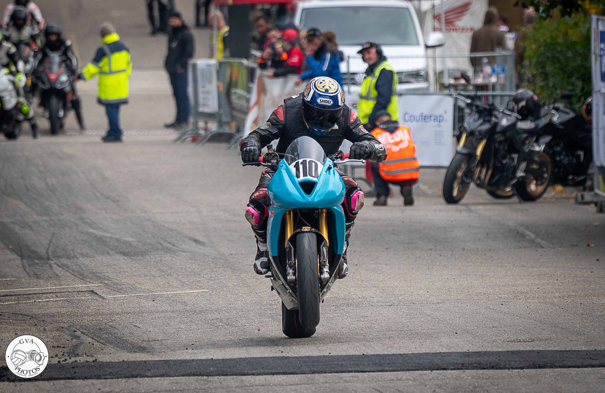 Greg Monaya gagne enfin cette catégorie et le scratch en 45.32, une consécration après son titre de champion de France Promosport 1000. Mais, en l’absence de Bryan Leu, impossible de savoir qui est le plus rapide. Pas loin derrière, Bernard Bally en 45.47 montre aux jeunes qu’il est toujours là. Vincent Droz, 3e, est arrivé dans cette catégorie avec sa CBR 1000 cette année et a fait 46.78.