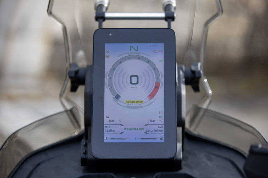 Abordons maintenant  le chapitre des reproches, en commençant par le commodo gauche, aux multiples fonctions, qui est trop compact et il fut courant (portant de gros gants hiver lors de ce test) de dérégler les trips lors de l’utilisation des clignotants. L’application CF Moto maintenant, permettant d’afficher Google Maps directement sur l’écran TFT, n’est utilisable qu’avec votre smartphone déverrouillé. Agaçant de le mettre ensuite dans sa poche sans savoir si l’application ne va pas quitter. L’utilisation est gratuite pendant un an, ensuite elle devient payante mais l’importateur suisse se penche sur une solution de prologation.