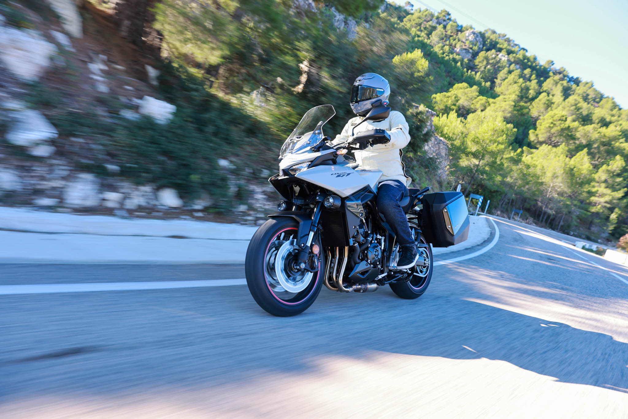 Le moteur est le même, 4 en ligne issu de la Fireblade de 2017 avec les adaptations pour maintenir son prix et proposer la bagatelle de 150 ch. quelques un de moins que le roadster. Les 102 Nm sont disponibles un tout petit peu plus tôt, pertinent pour l’usage prévu. L’avant du châssis est également le même, il change à partir de la boucle arrière soudée qui doit offrir davantage d’espace à un éventuel passager et accueillir les valises. Destinée à voyager, autant que la CB1000GT les ait de série.
